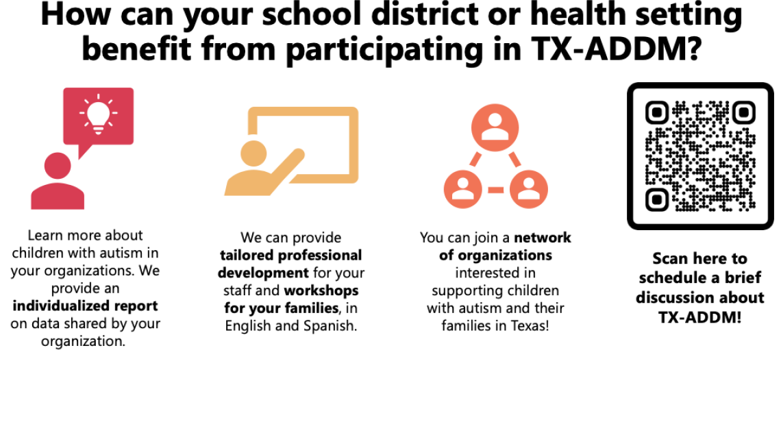 Partnerships TX-ADDM is looking to partner with education and health sources to identify the prevalence of autism in Texas, this includes school districts, early education centers, hospitals, clinics, and state partners. Information Request